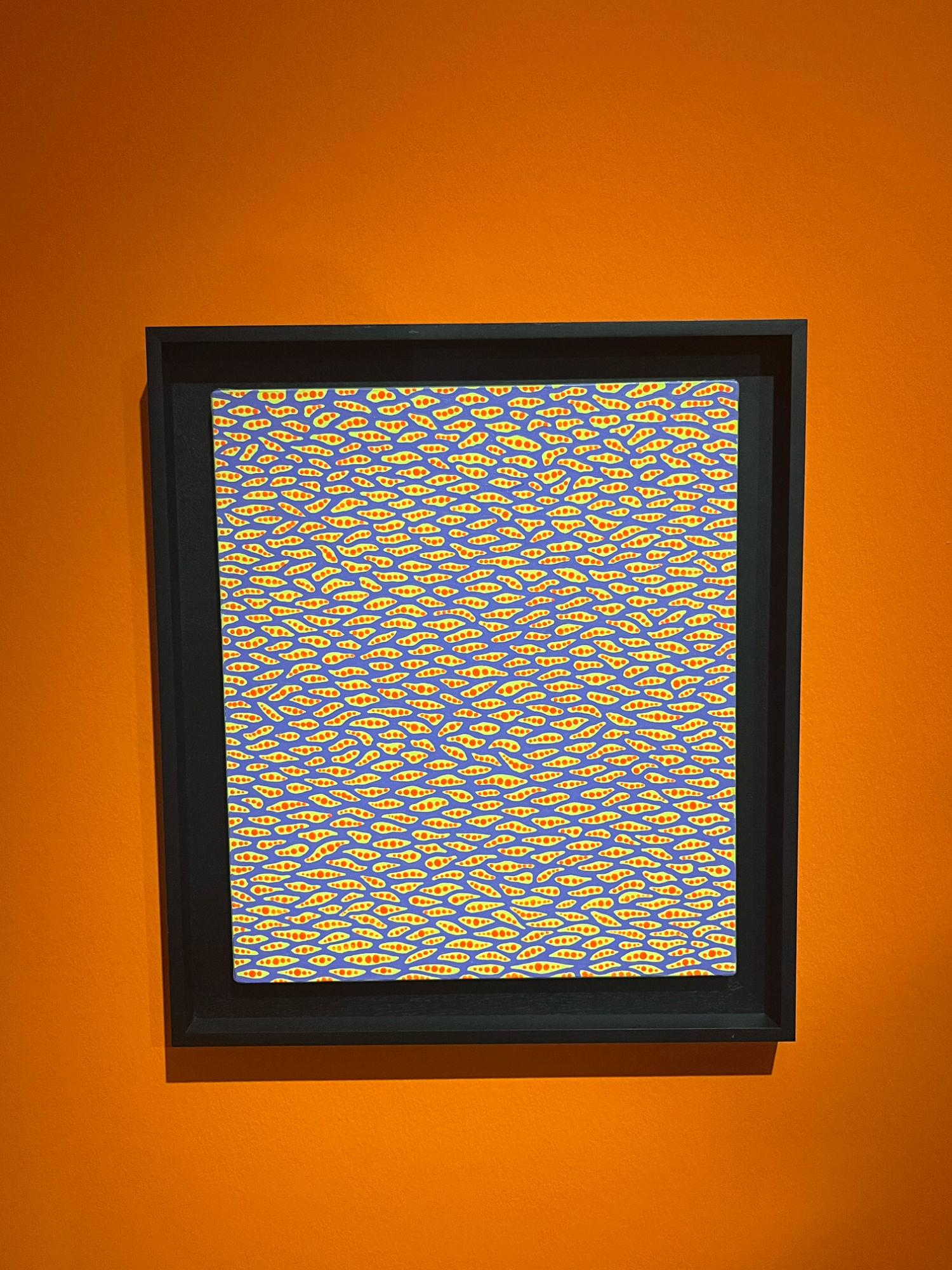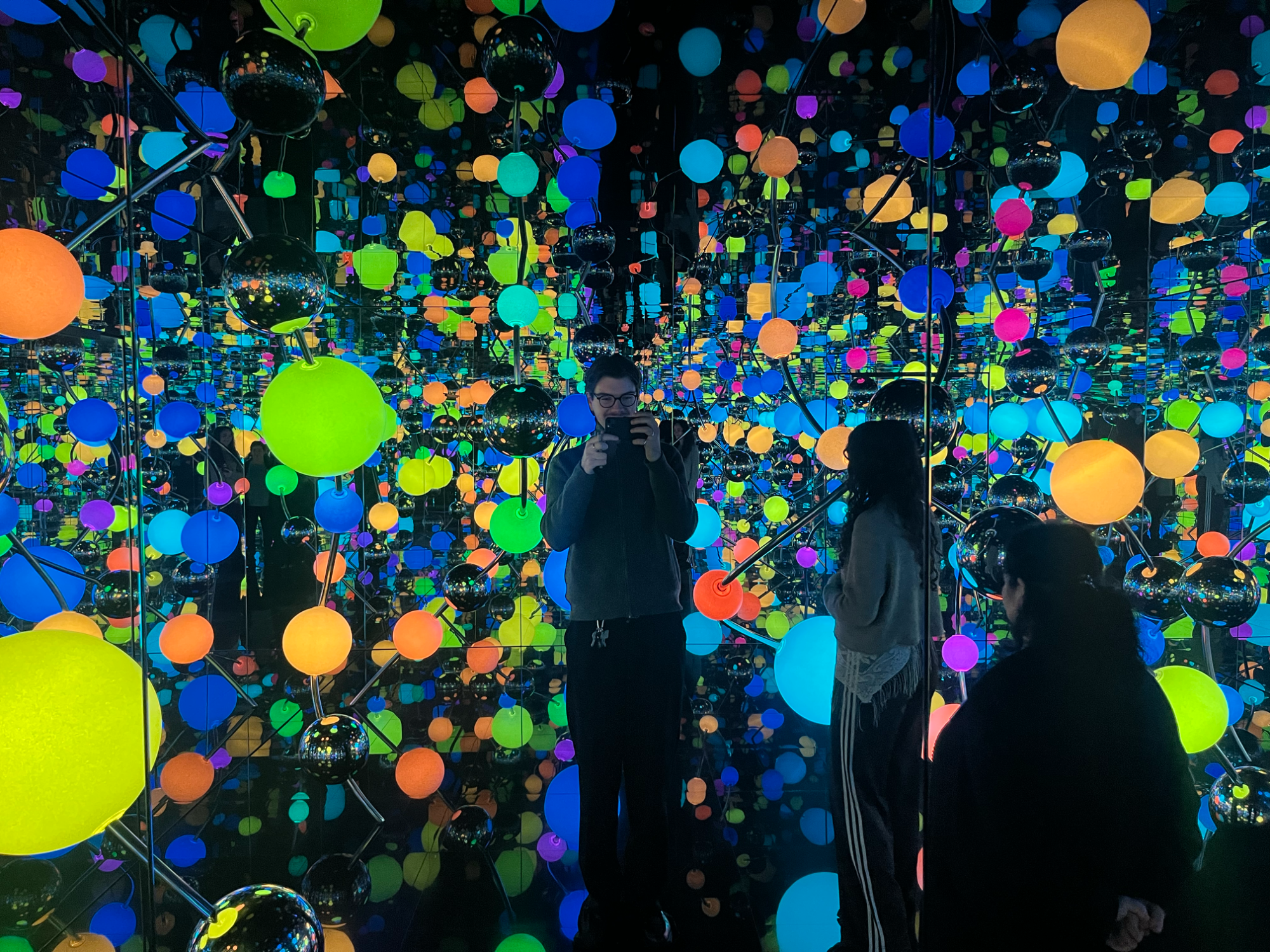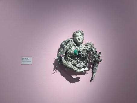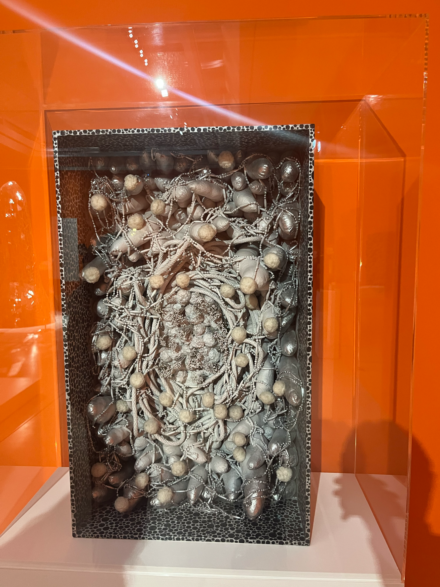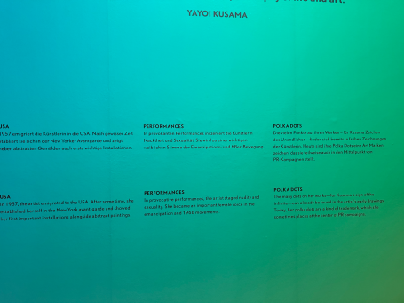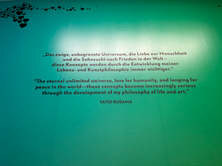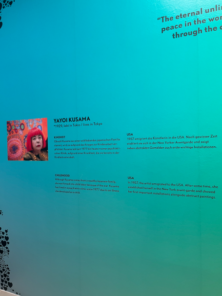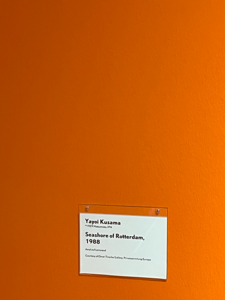 Die japanische Künstlerin Yayoi Kusama, die einen Teil ihres Lebens in New York verbrachte, ist vor allem für ihre charakteristischen Punkte und Kürbismotive bekannt. Auf einem Kürbis in Chromeoptik direkt am Eingang sind diese beiden Charakteristika direkt zusammengebracht. Ihre Werke zeichnen sich durch repetitive Strukturen und eine starke Wiedererkennbarkeit aus.