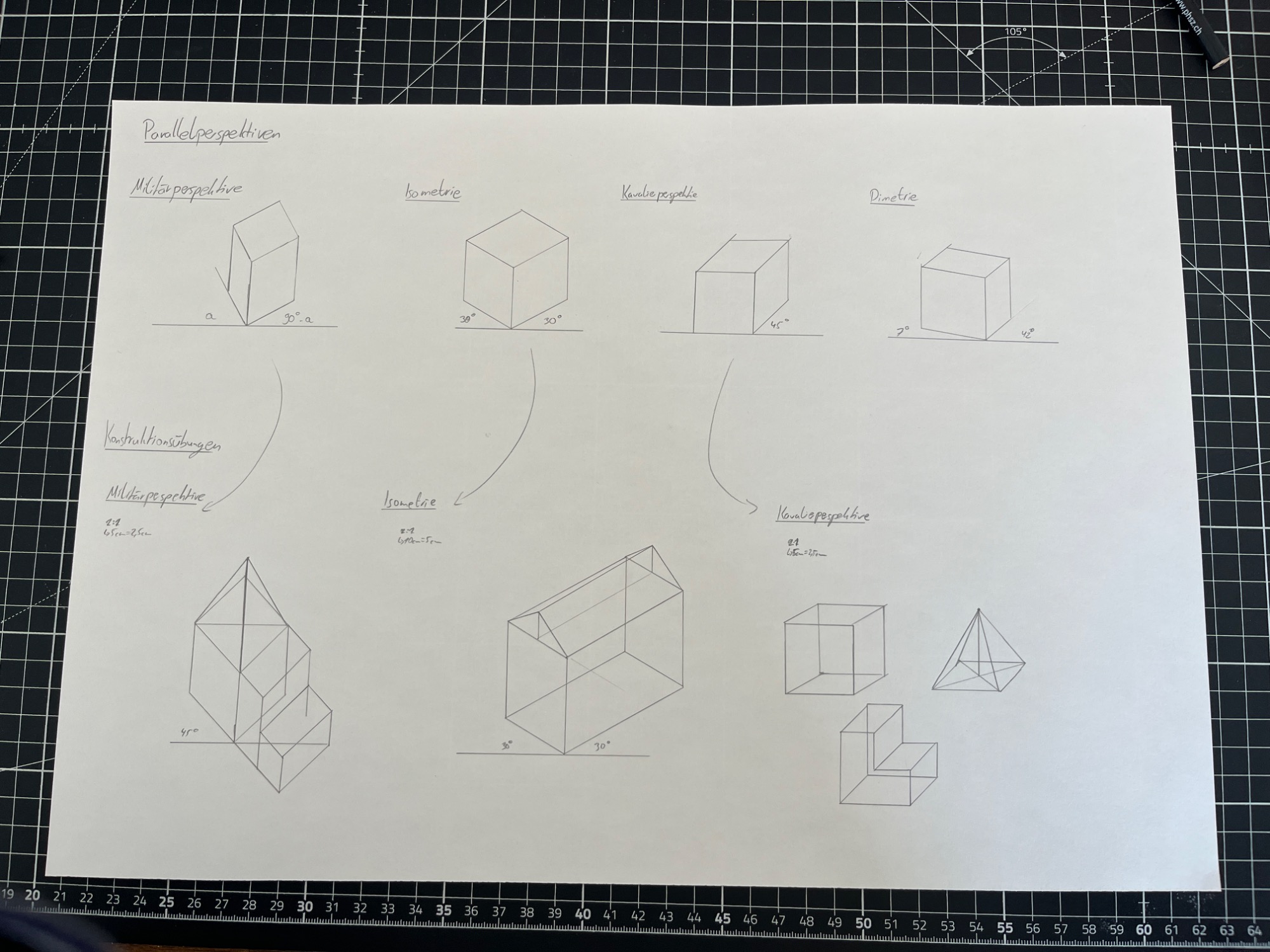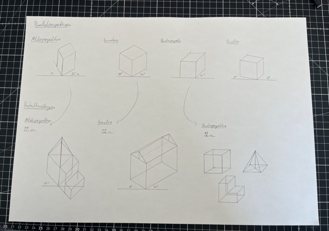 Auf dieser Seite lassen sich alle Zeichnungen zum Themenkomplex Raum finden. Dieser beginnt zunächst mit einigen Vorübungen zu parallelperspektivischen Konstruktionen und Übungen zu Messen und Sehen.