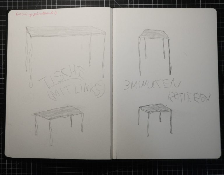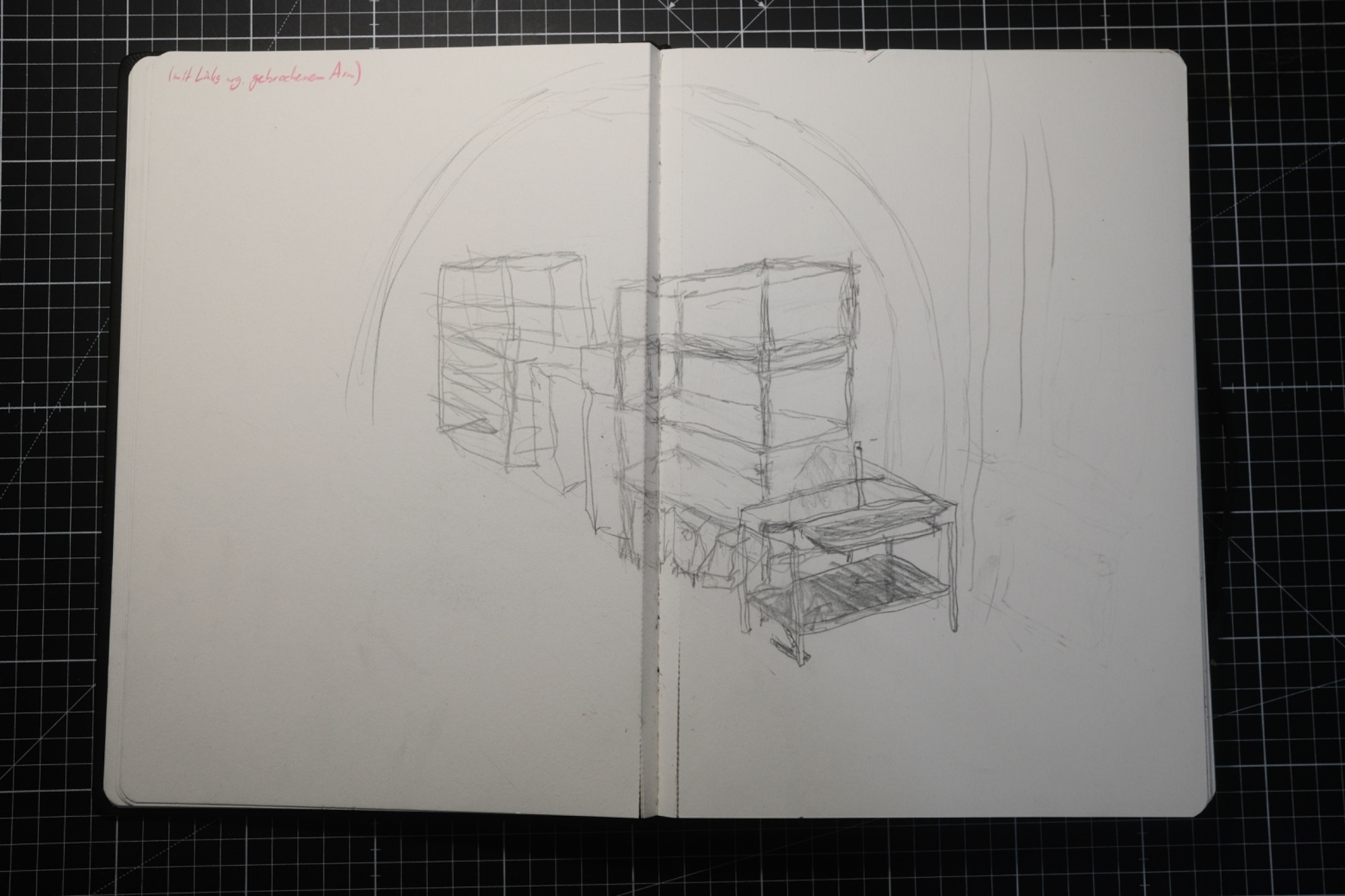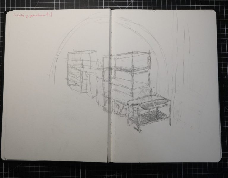 Die Zeichnung ganzer Räume löste eine besondere Begeisterung aus. Spontane Linienführung bei gleichzeitiger Beachtung der Perspektive. Viele Dinge und eine Art Eintauchen in den Raum. Vom Sehen und Messen mit dem Bleistift und roher Skizze hin zu einem Fenster zu verborgenen Räumen.